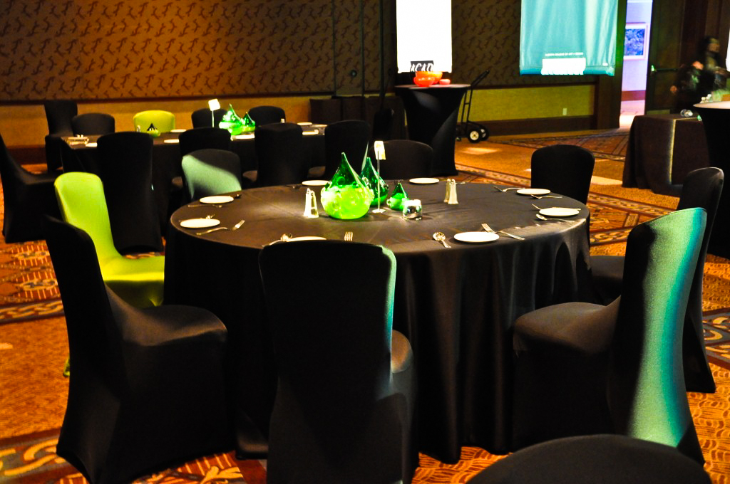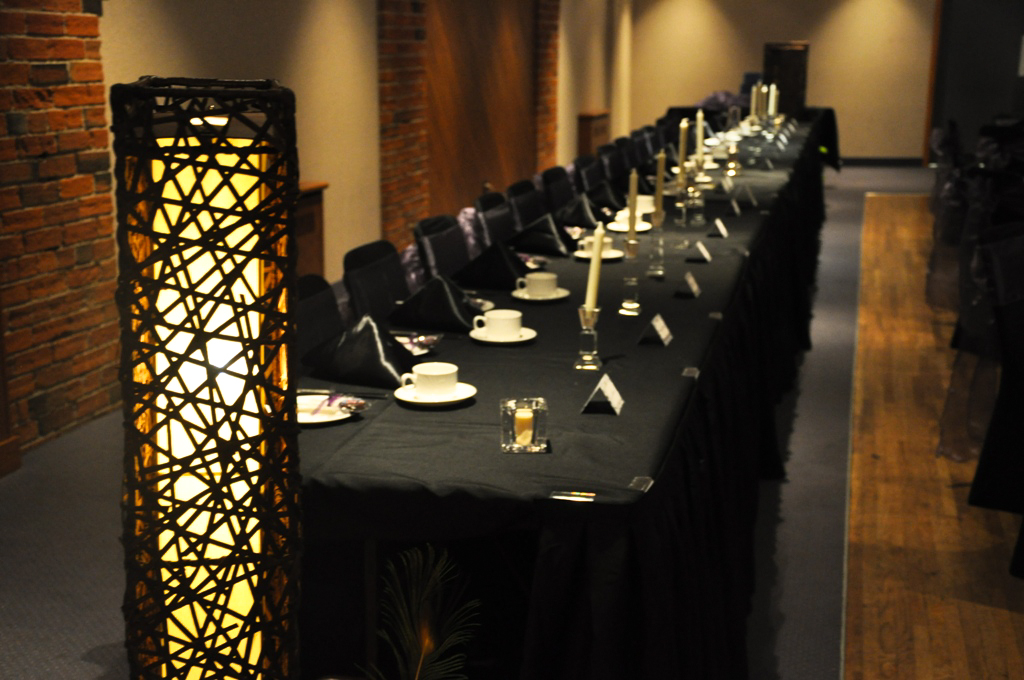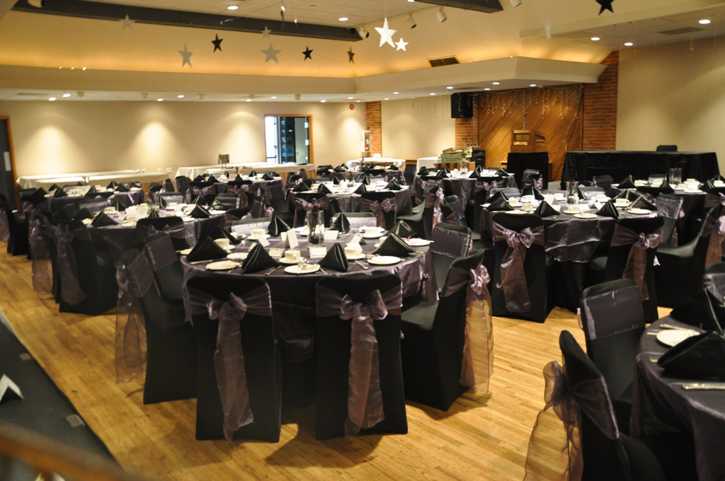 Danish Club, Calgary. Black Spandex Chair Covers with Plum Organza Sash. On the tables are Plum Organza Table Runners and Black Satin Napkins