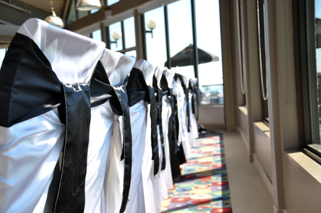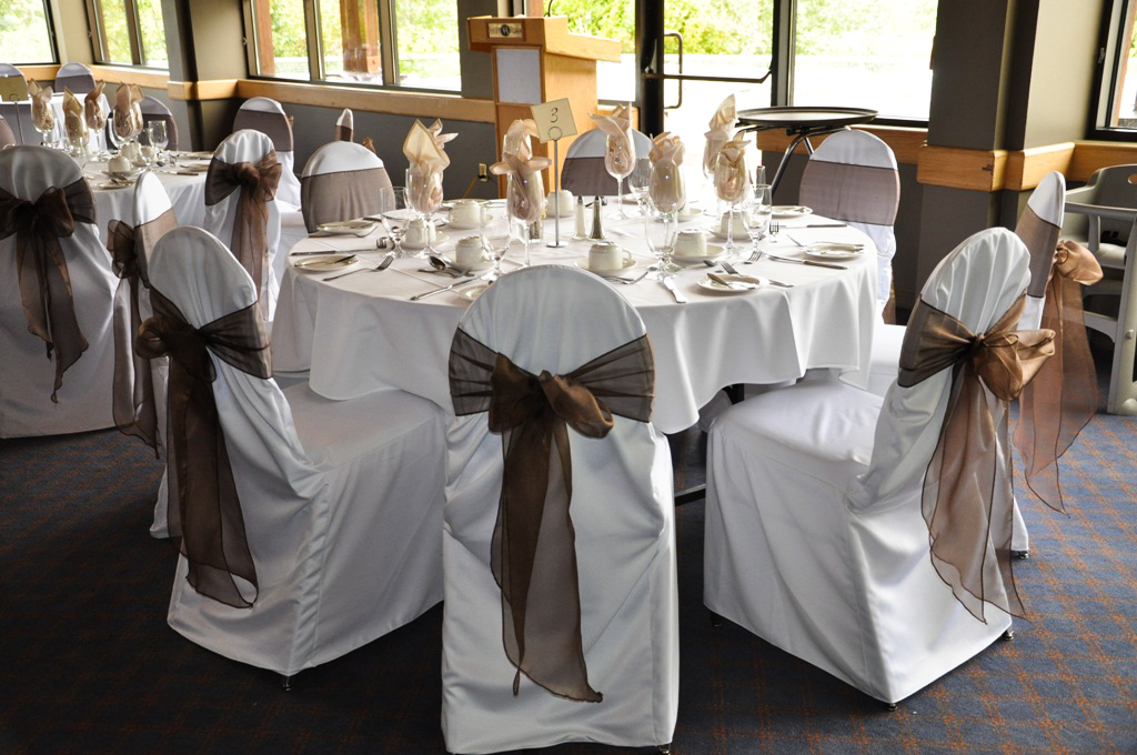 Valley Ridge Golf Course, Calgary. White Banquet Chair Covers with Chocolate Brown Organza Sash.