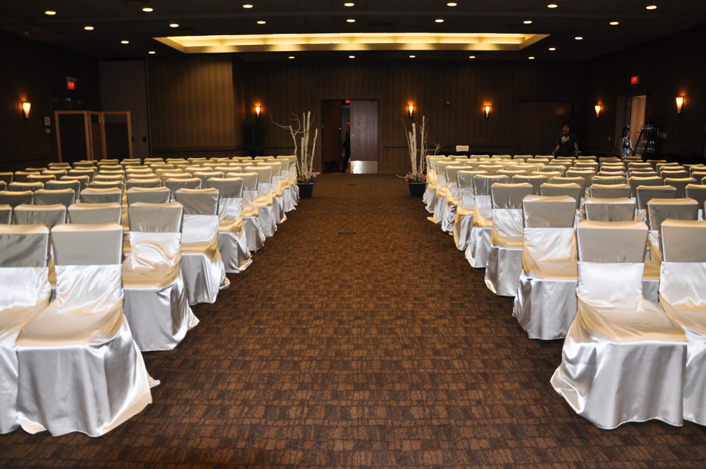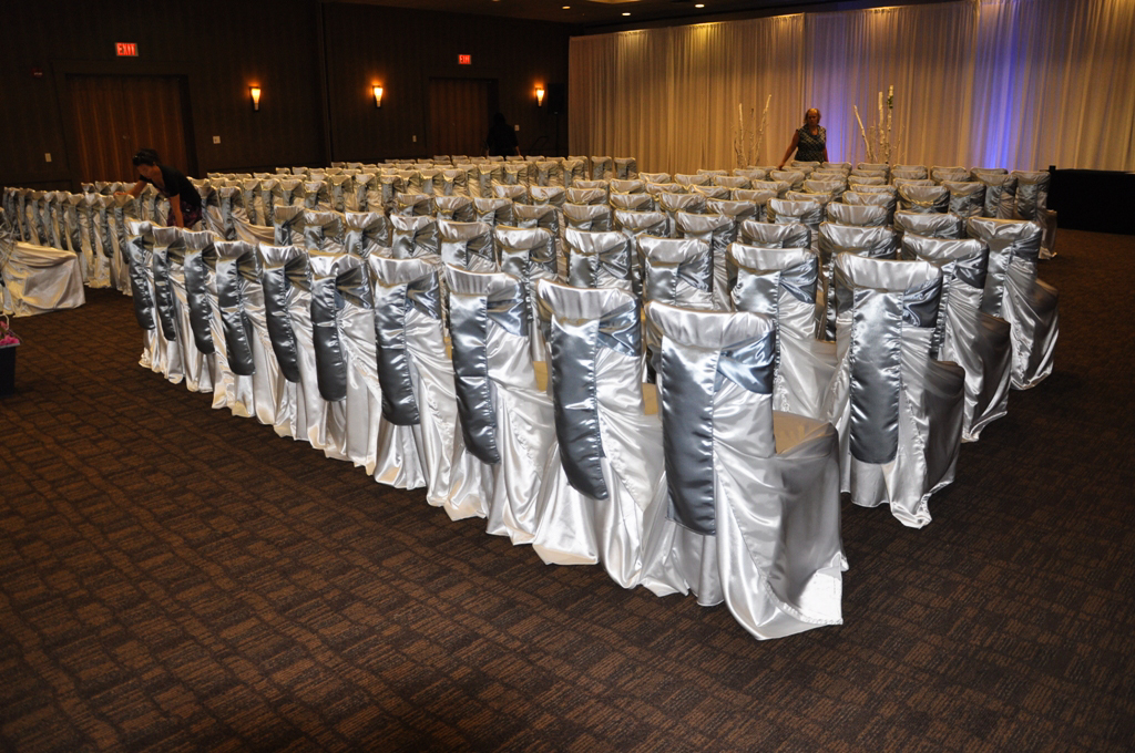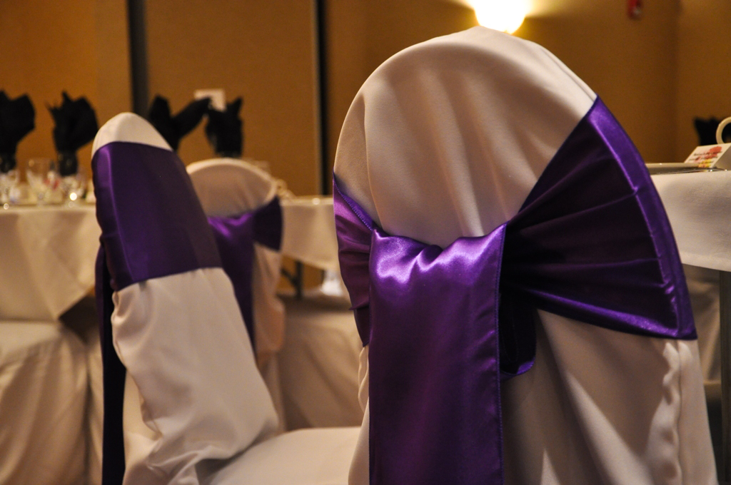 Raddison Hotel, Calgary. White Banquet Chair Covers with Purple Satin Sash