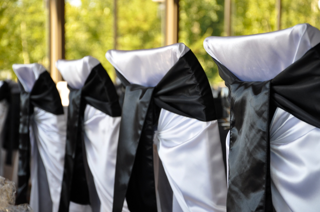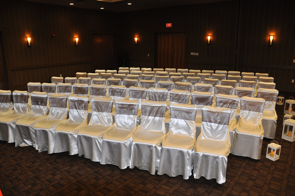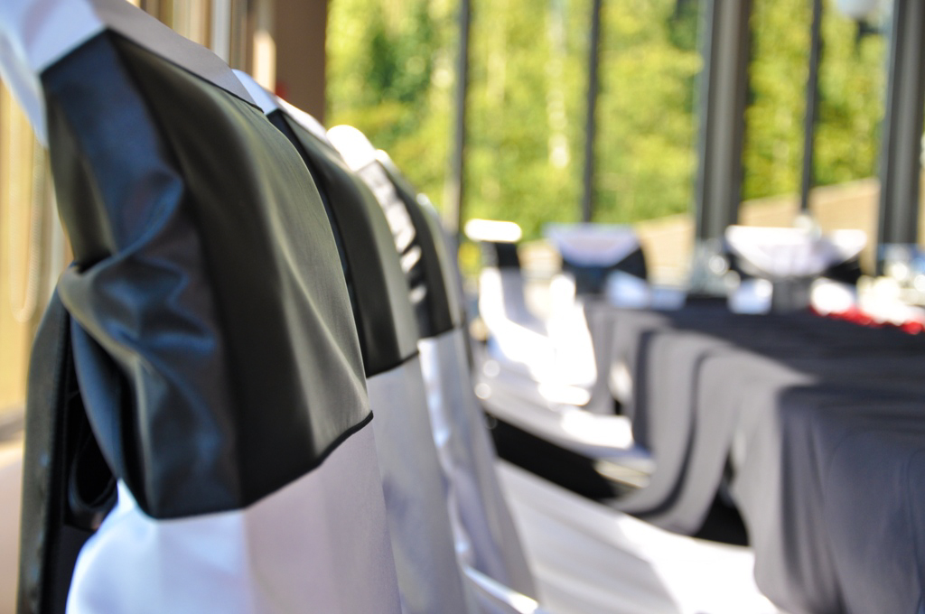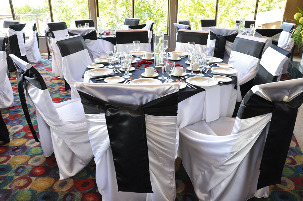 Priddis Greens Golf Course, Priddis. White Satin Self Tie Chair Covers with Black Satin Sash