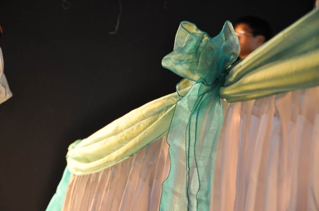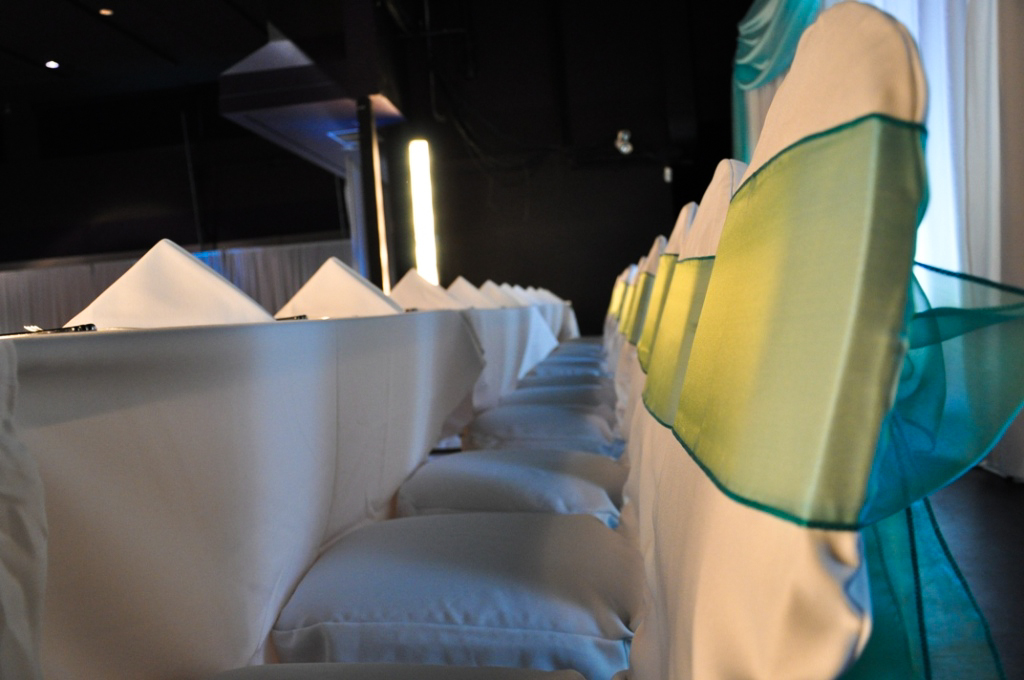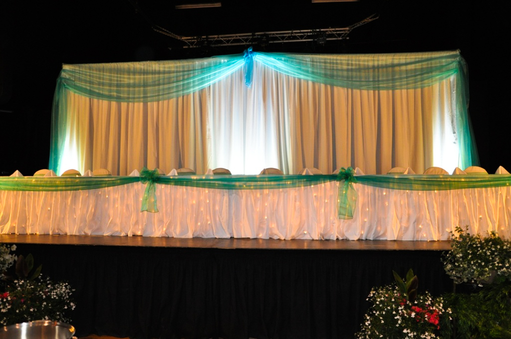 BraggCreek. Teal Organza Sash for Head table with White Table Skirting. Underneath the Table Skirting are Lights to showcase the head table