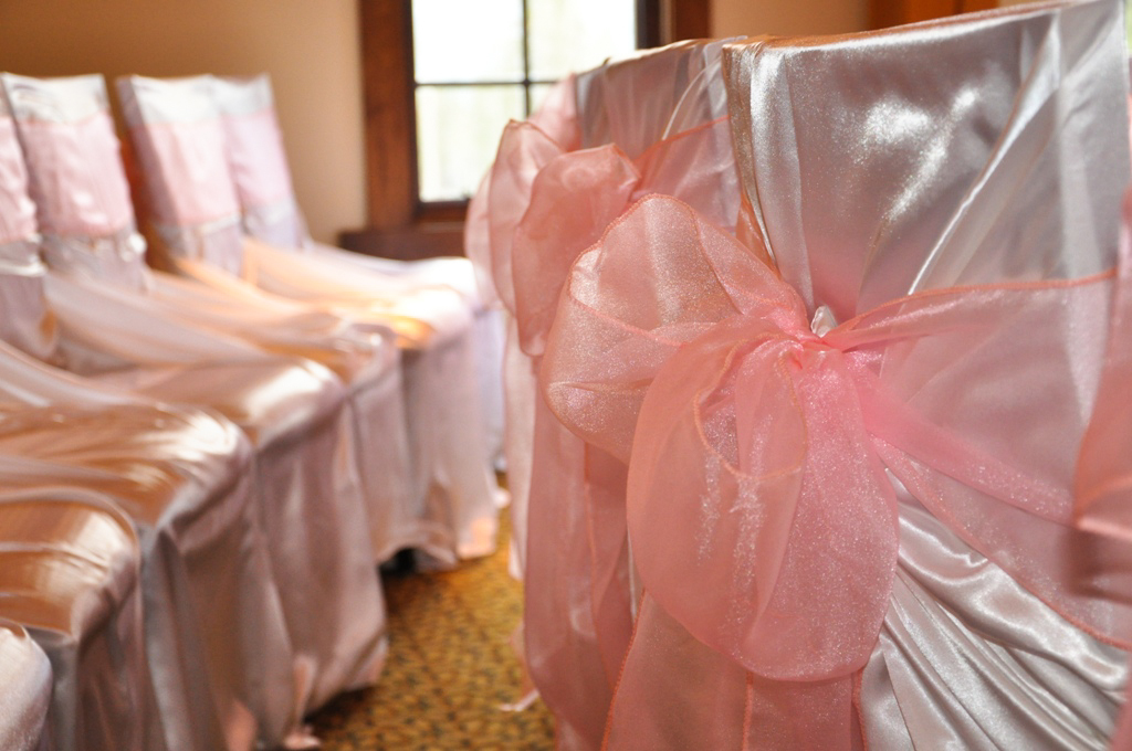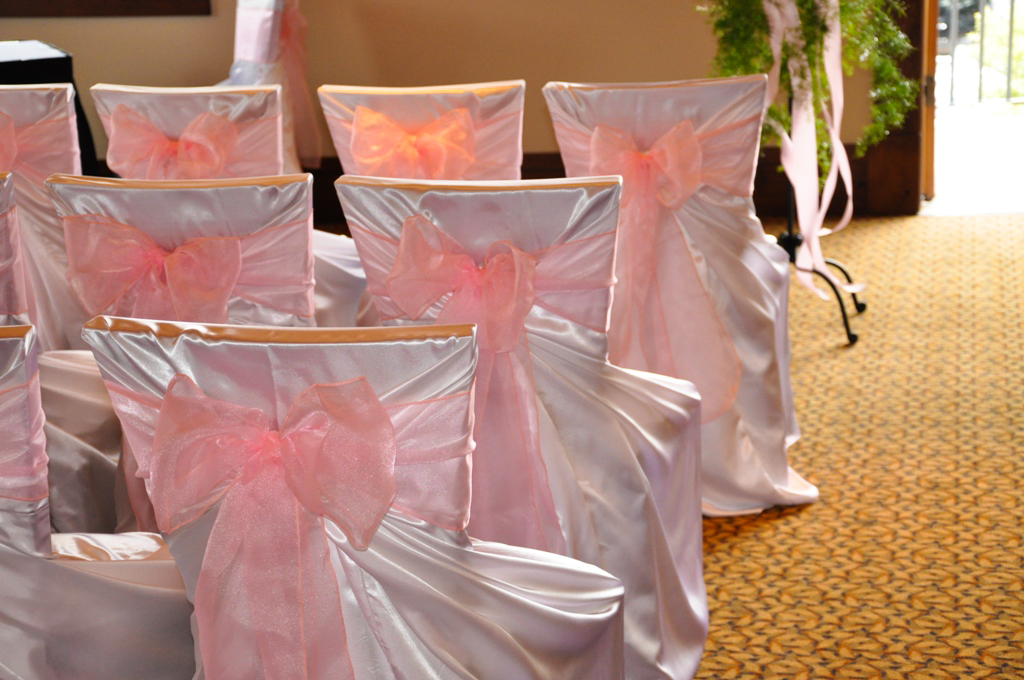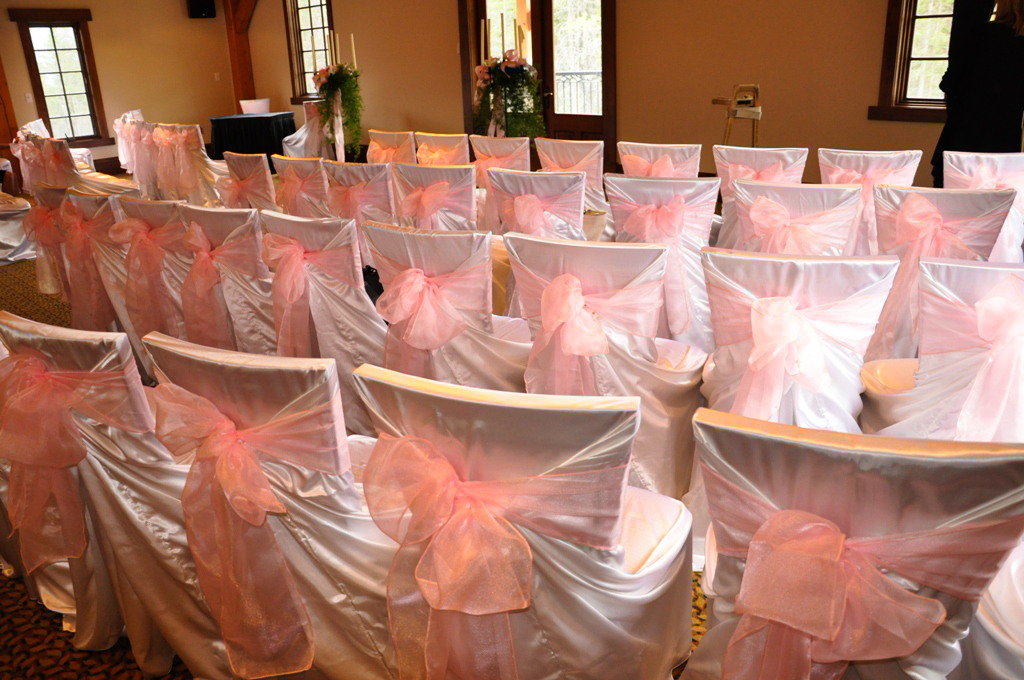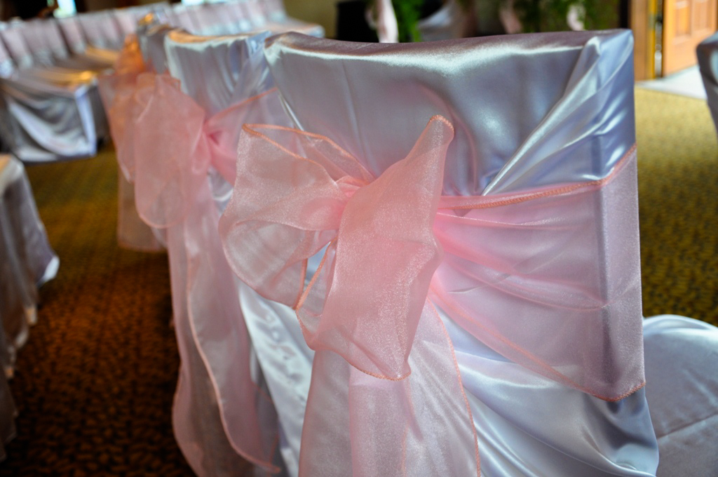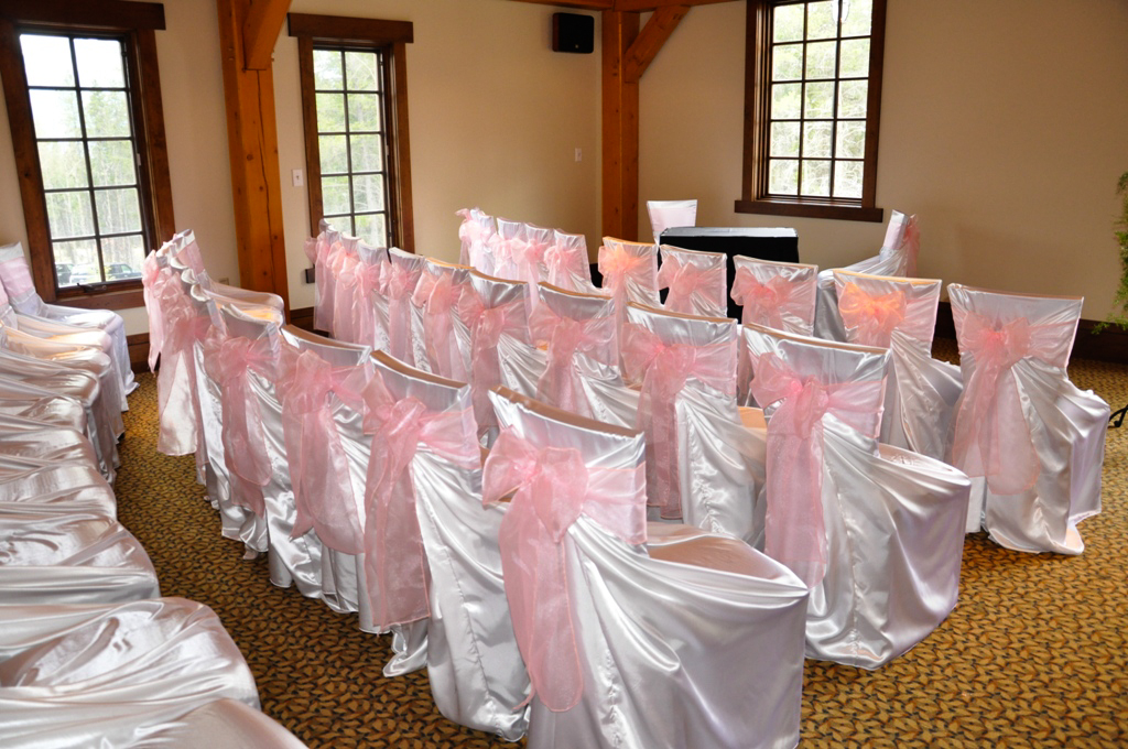 SilverTip Resort, Canmore. White Satin Self Tie Chair Covers with Pink Organza Sash.