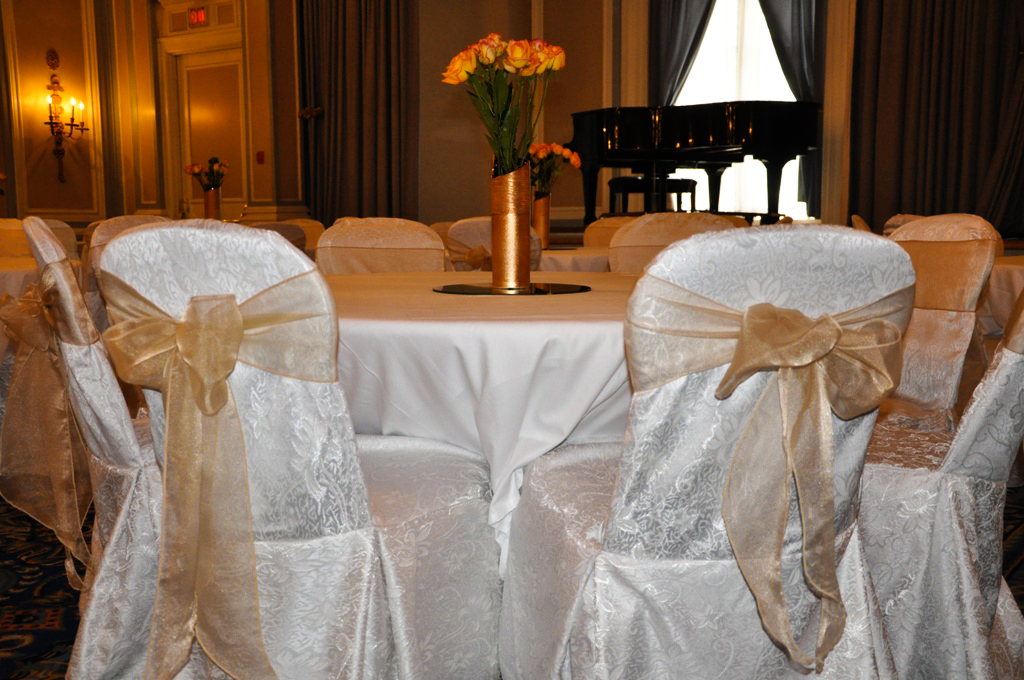 Fairmont Palliser Hotel, Calgary. White Damask Chair Covers with Champagne Organza Sash
