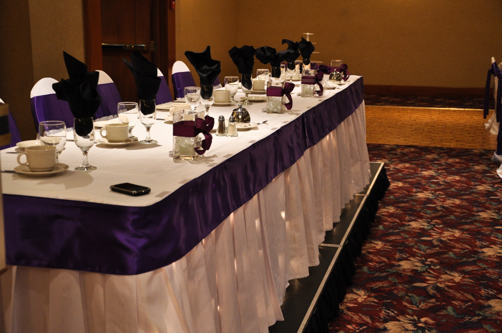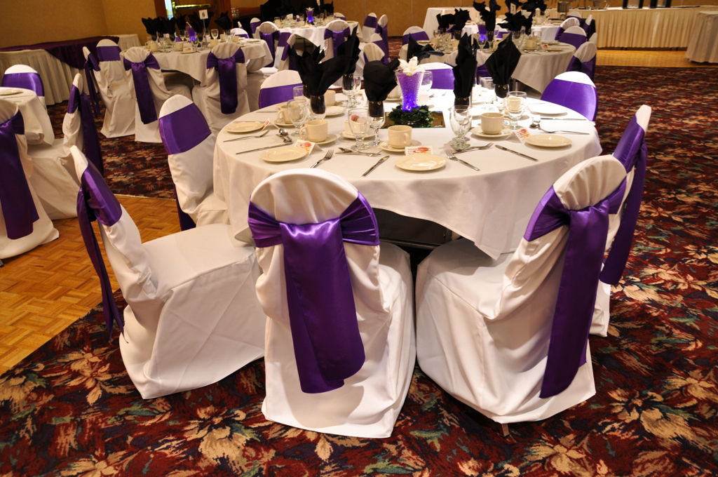 Raddison Hotel, Calgary. White Banquet Chair Covers with Purple Satin Sash. The table is accentuated with Purple Satin Sash