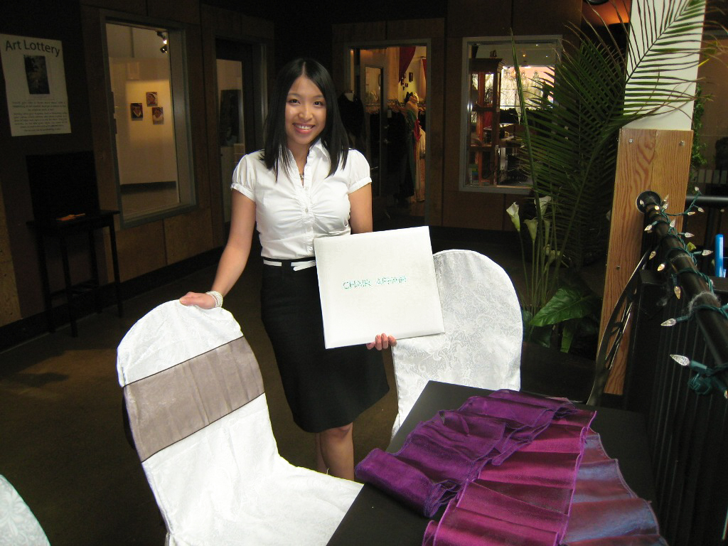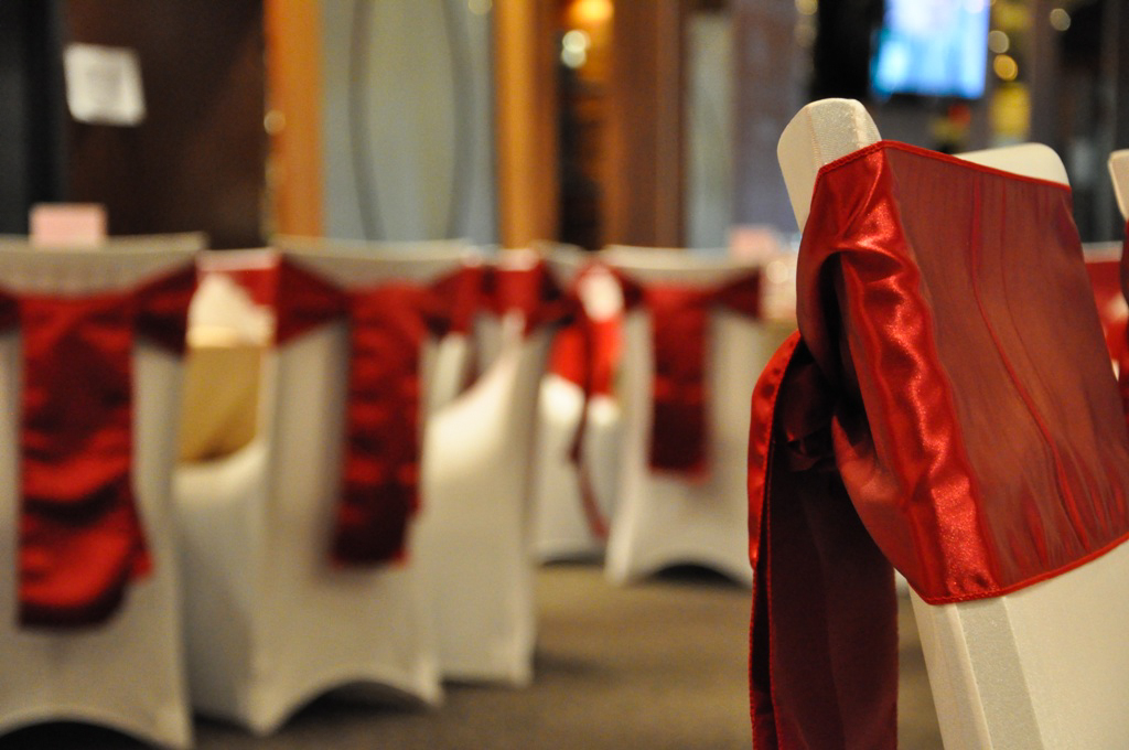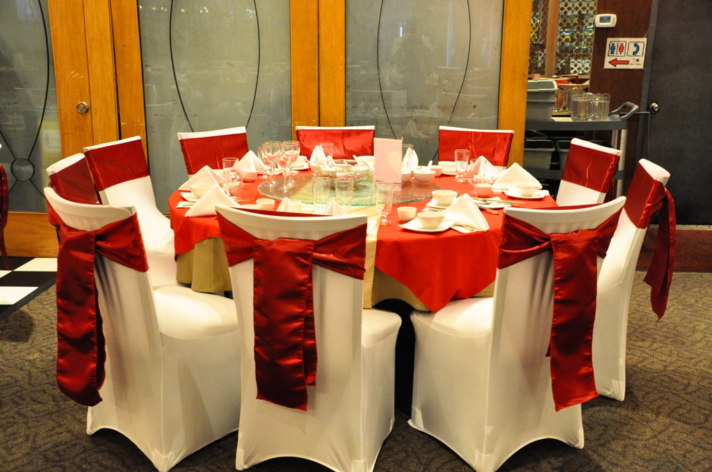 Forbidden City, Calgary. White Spandex Chair Cover with Red Satin Sash